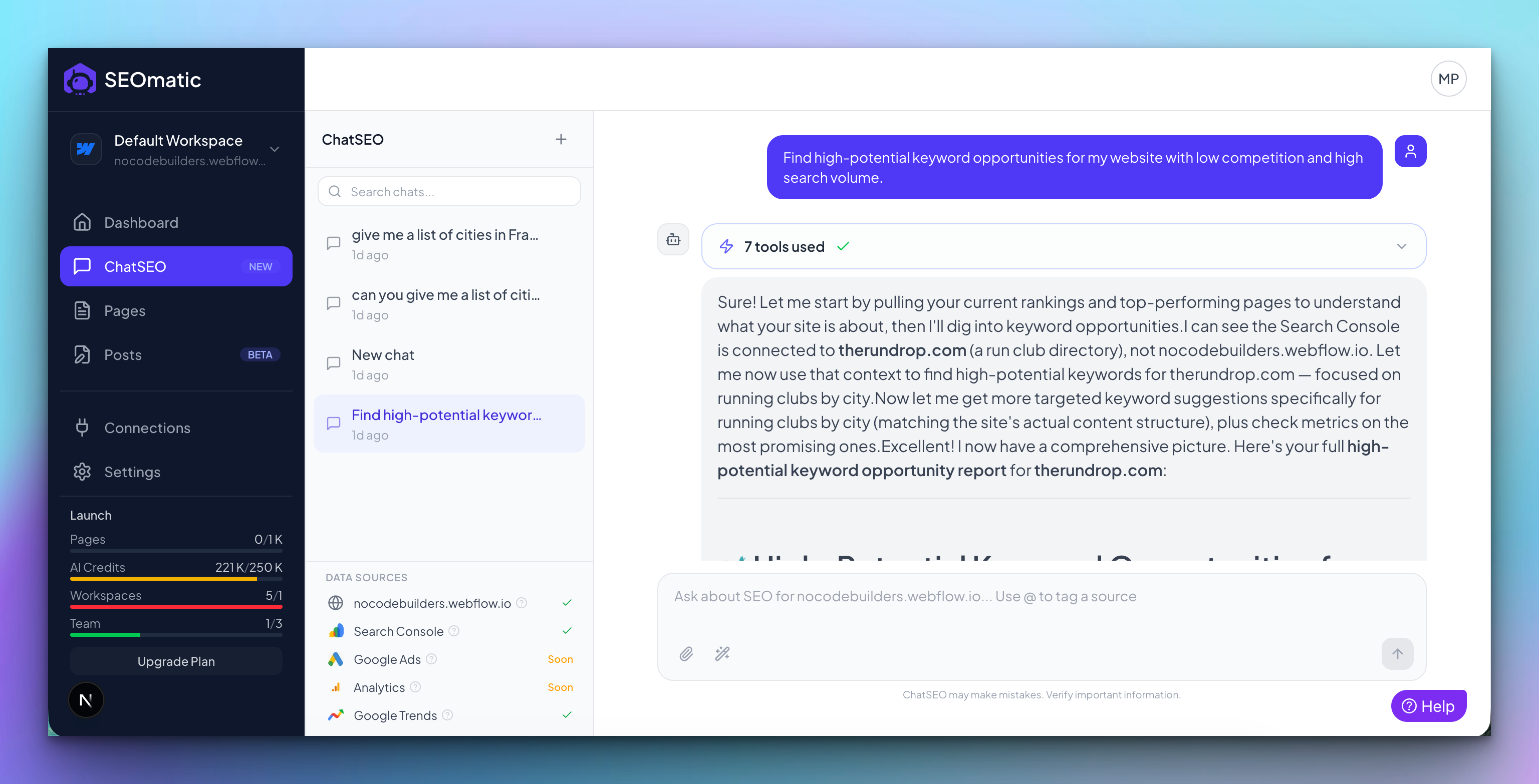 ChatSEO helps you get actionable insights and outputs for your website, so you can spend less time researching and more time building.